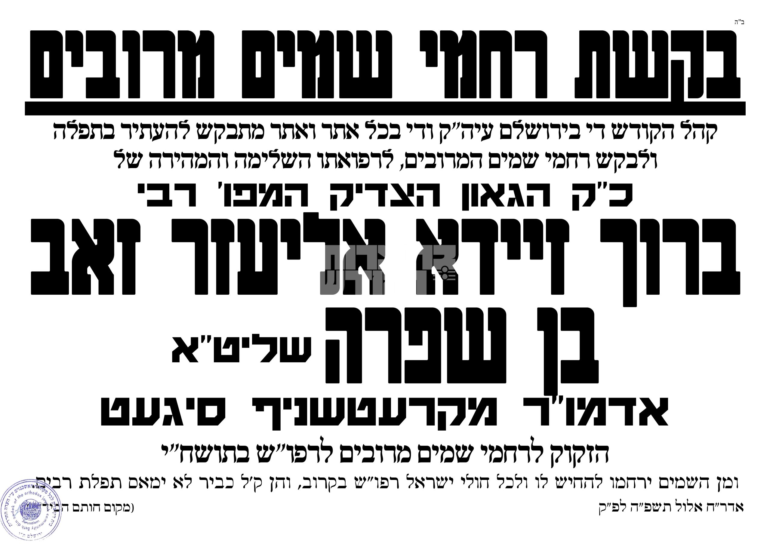 נאמען צוגעלייגט פאר האד' מקרעטשניף סיגעט עפ"י הוראת הרבנים; מרן ברוך זיידא אליעזר זאב בן שפרה לרפו"ש