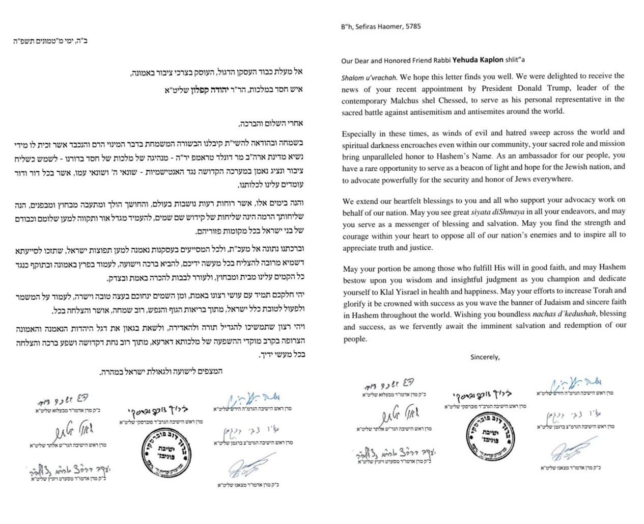 אין די יעצטיגע טעג איז פארעפנטליכט געווארן א זעלטן געמיינזאמע באגריסונג-בריוו וואס איז געשריבן און אפגעשיקט געווארן דורך די גדולי אדמורי"ם וראשי ישיבות בדורינו, צום לעגענדארן מקורב למלכות און שתדלן אינעם ווייסן הויז, הרב יהודה קאפלאן, לרגל זיין עהרנפולע אויפנאמע דורכ'ן אמעריקאנעם פרעזידענט טראמפ יר"ה אלס פירער פון פעדעראלע קאמיטע קעגן אנטיסעמטיזם.