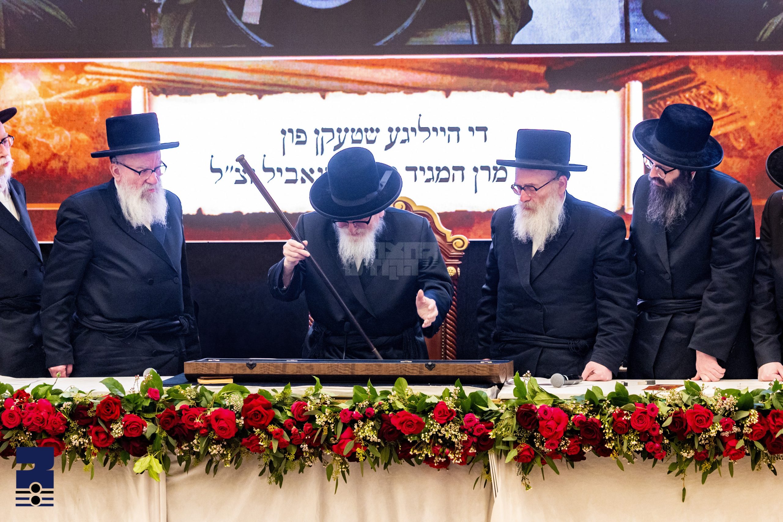ארום האלב אכט איז דער רבי שליט"א ערשינען אין זאל, ותהי המקום לחרדת אלקים, ווען עס הייבן זיך אן באווייזן די חפצי קודש, ווען עס האט זיך שוין באוויזן לעיני כל הקהל די מטה אלקים, די הייליגע שטעקן פונעם טשערנאבלער מגיד זי"ע, וואס הרה"צ רבי אהרן מענדל שליט"א האט געהאלטן אין א ספעציעלע קעסטל וואס איז געווארן ערצייגט ספעציעל צו קענען ברענגען דערין דעם שטעקן ביים מעמד.