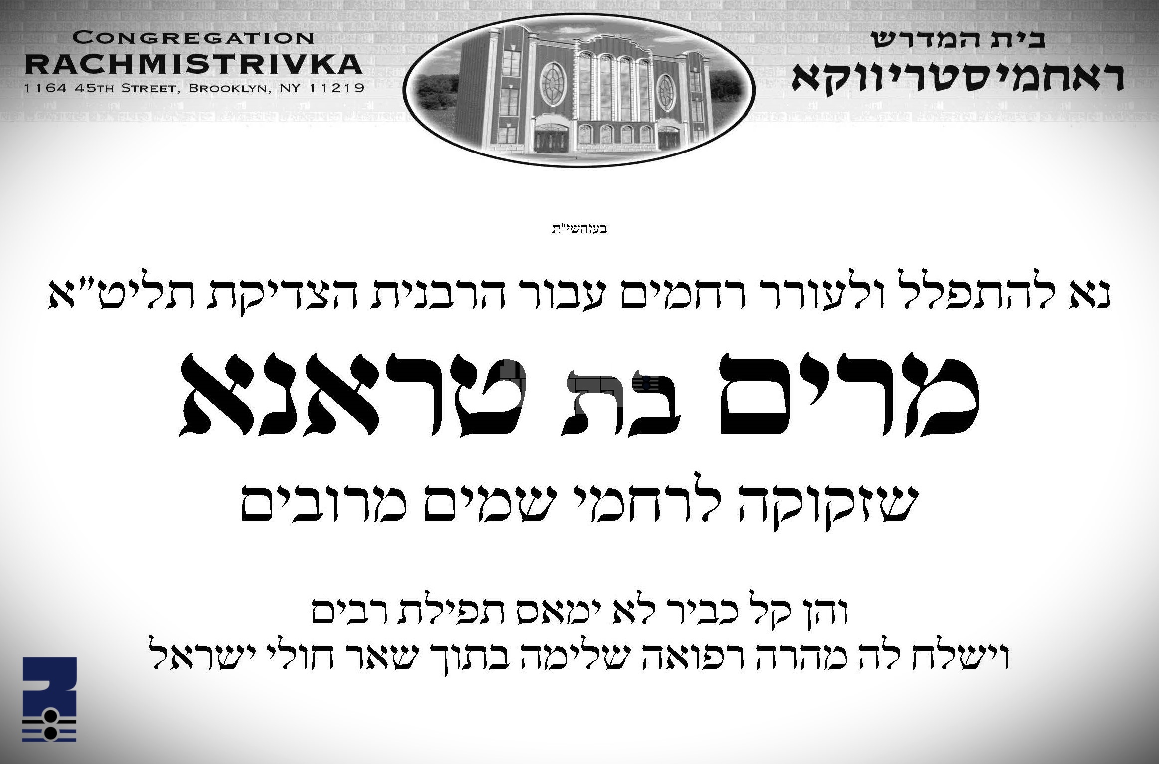 נעכטן זונטאג האבן זיך הונדערטער נשות ראחמיסטריווקא צונויפגענימען אויף א טעלעפאנישע מעמד תפילה לרפואתה השלימה פון די הויכגעשעצטע רעבעצען אמא של מלכות, גלייכצייטיג זענען חסידי ראחמיסטריווקא מתפלל לבריאתה השלימה, הרבנית מרת מרים בן טראני בתוך שאר חולי ישראל.