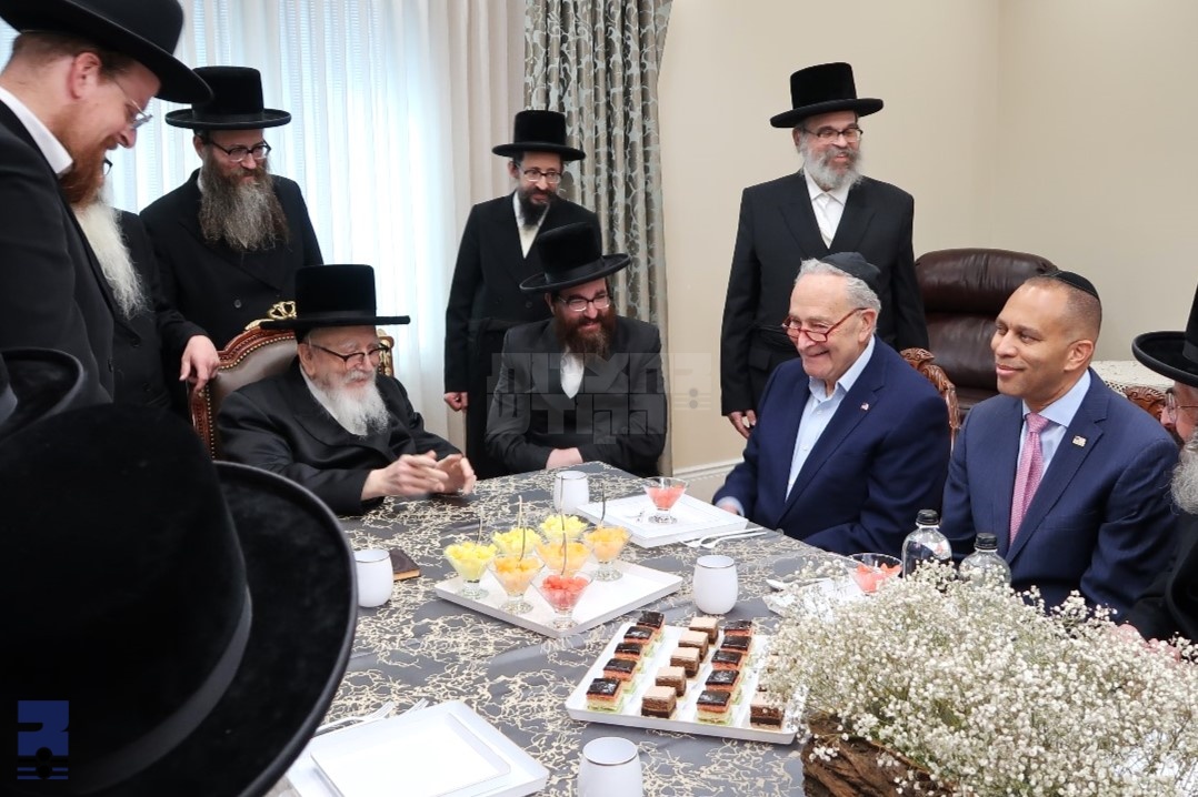 מיט'ן העכסטן מאס כבודה של מלכות איז היינט אפגעהאלטן געווארן אן עהרנפולע אויפנאמע בביתו נאוה קודש פון כ"ק אדמו"ר מסקווירא שליט"א פאר די סאמע העכסטע פירער אין די אמעריקאנע געזעץ הייזער, דער סענאט מאיאריטעט פירער טשאק שומער, און דער קאנגרעס מינאריטעט פירער העקעם דזשעפעריס, וועלכע זענען געקומען זוכן שטיצע פון ק"ק סקווירא מיט אירע טויזנטער שטים-בארעכטיגטע וויילער ביי די בעפארשטייענדע וואלן קומענדיגע וואך.