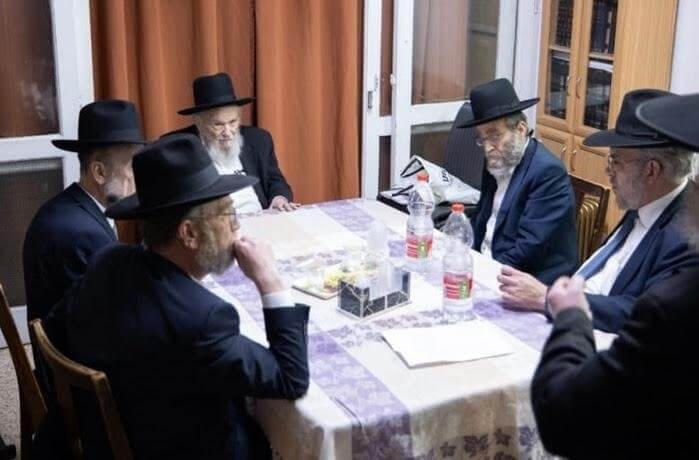 דרינגעדע אסיפה במעונו פון הגאון רבי משה הלל הירש ראש ישיבת סלאבודקא נאך בג"ץ אורטייל איבער חוק הגיוס