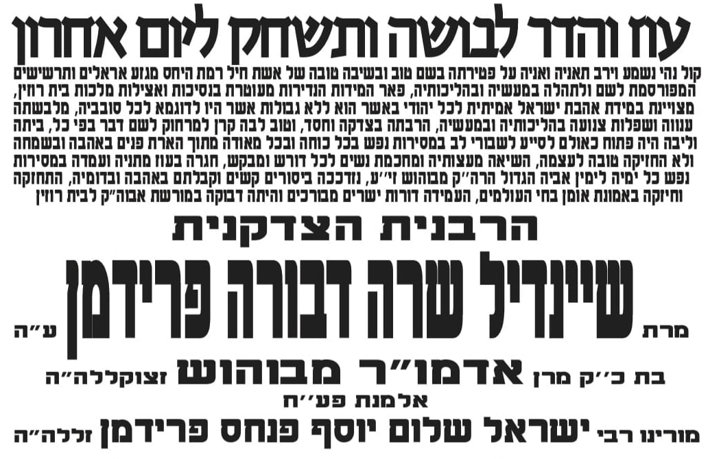 די רעבעצין ע"ה – בתו היחידה פון כ"ק אדמו"ר הרה"ק רבי יצחק מבוהוש זצ"ל, און אלמנת הרה"צ ר' ישראל שלום יוסף פנחס פרידמאן זצ"ל מפאשקאן איז געווען מגזע אראלים ותרשישים און שריד לדור דעה און האט זוכה געווען צו זעהן עולמה בחייה מיטן אוועק שטעלן דעם שיינעם דור, בנין וחתנין רבנן, בנה יחידה כ"ק אדמו"ר מבוהוש שליט"א און חתנה יחידה כ"ק אדמו"ר מביאלא רמת אהרן שליט"א, אייניקלעך און איר אייניקלעך לשם ולתפארת.
