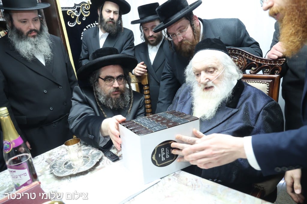 יעצט נאכמיטאג האט גה"צ אבד"ק סאטמאר וויליאמסבורג שליט"א באזוכט ביי כ"ק מרן ראב"ד ירושלים שליט"א אין ירושלים, די רב האט איבערגעגעבן א פריסת שלום פון אביו כ"ק האדמו"ר מסאטמאר שליט"א אין איינגעלאדנט צום מעמד כינוס חסידי סאטמאר וואס קומט פאר היינט נאכט און ירושלים עיה"ק. דער ראש בית דין האט מכבד געוועהן דעם גאסט מיט לחיים אין איבערגעגעבן די נייע סעט ספרים מועדים וזמנים וואס איז לעצטענס ערשינען לאור עולם.