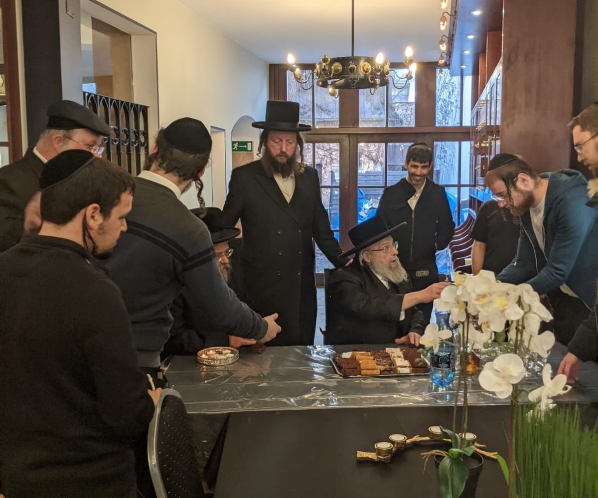 קול בחצרות – כ"ק האדמו"ר מפינסק קארלין וועלכע האלט זיך די טעג אויף אין אייראפע אויף א נסיעה צו די מקומות הקודשים איז היינט אנגעקומען קיין קראקא ווי דער רבי האט געדאווענט מנחה אין דערנאך אפגעראכטן א מסיבת לחיים אינעם נייעם הכנסת אורחים האטעל 'אהל אברהם' אין קראקא