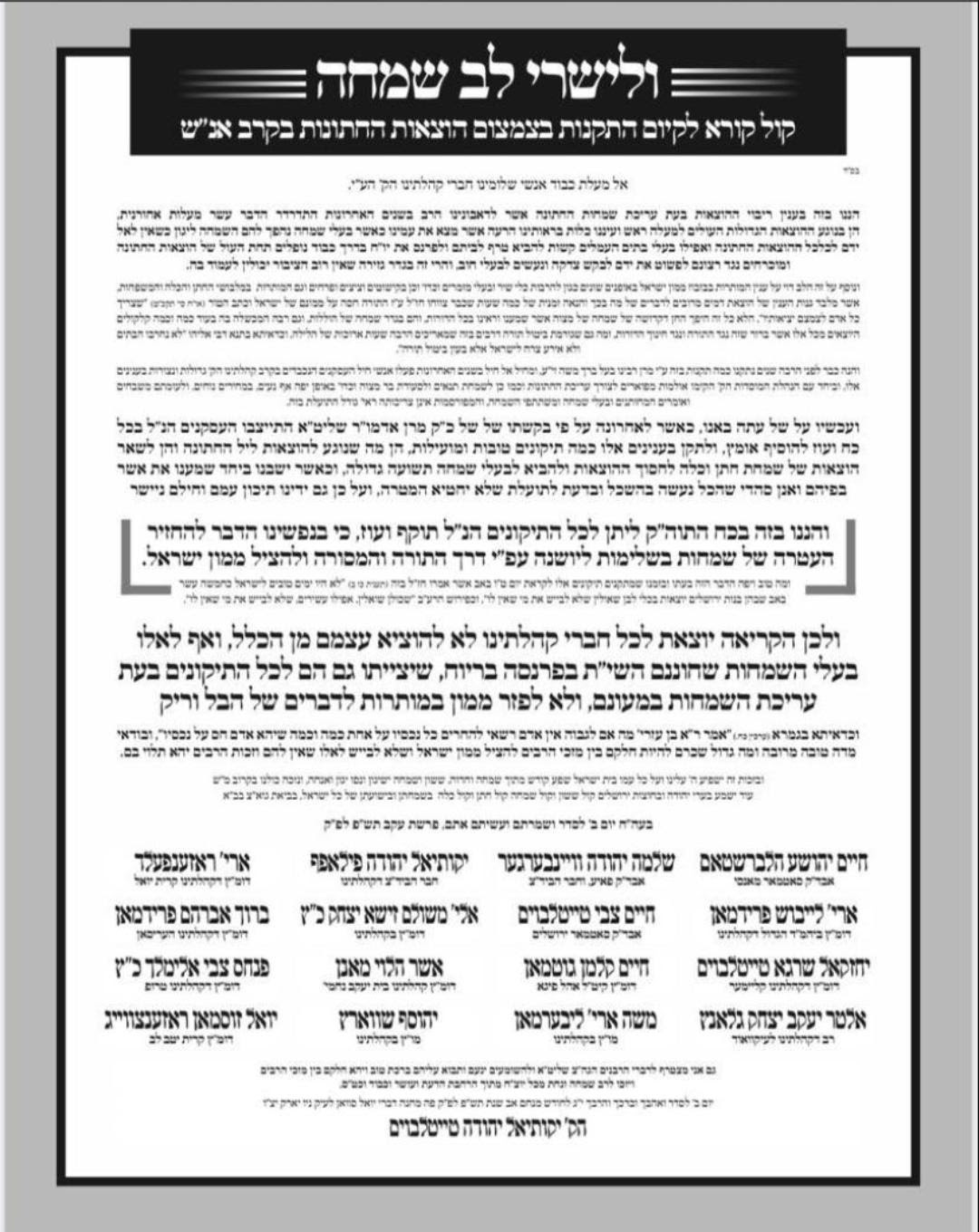 פארלאפענעם מאנטאג עקב איז אפגעהאלטן געווארן א וויכטיגע 'אסיפת הרבנים' בביתו נאוה קודש פון כ"ק אדמו"ר מסאטמאר (מהרז"ל) שליט"א אין סוואן-לעיק וואו עס איז אדורכגעטון געווארן די ברענעדיגע נושא ארום דעם ביטערן 'גזירת החינוך' אין ניו יורק ווען געוויסע אזוי גערופענע עסקנים פרובירן איינצוגיין אויף פשרות אין נאמען פונעם יהדות החרדית אין די צייט וואס זיי טון נישט אנפרעגן די דעת תורה פון אלע מנהגיגי הקהלות וועמען זיי שטעלן זיך אהער אז זייערע פארטערטער. ביים ענדע פון די אסיפה האט מען אויך ארומגערעדט א קורצע וויילע איבער די פרישע 'חתונה סטאנדארט' וועלכע איז פראקלאמירט געווארן דורך צענדליגע קהלות קדושות בישראל אין א פראוו איינצושפארן די אומגעהויערע חתונה-קאסטן. דערביי האבן די דייני הקהלה אונטערגעשריבן א פאראייניגטע 'קול קורא' ווי זיי רופן צו יעדע 'חבר הקהלה' בלי שום יוצא מן הכלל – און אויך די וועלכע דער אויבערשטער האט זיי באשאנקען מיט פרנסה בריוח – זאלן איינהאלטן די פרישע 'חתונה סטאנדארט' און נישט אויסגעבן דאס געלט אויף 'מותרות' און 'הבל וריק'.
