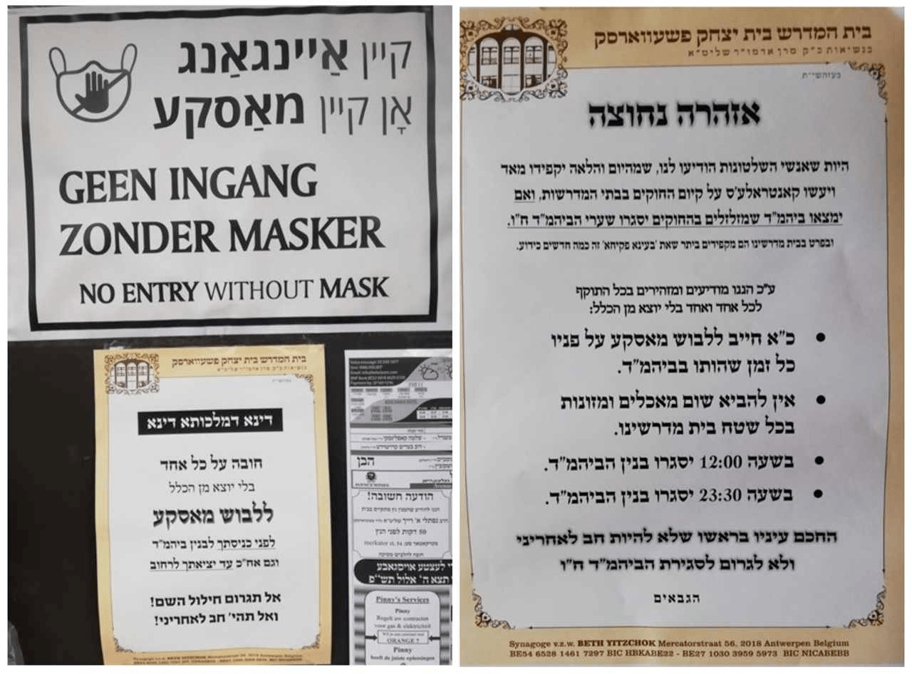 אין ביהמ"ד הגדול בית יצחק פשעווארסק אין אנטווערפן איז געהאנגען געווארן א מודעה אז 'דינא דמלכותא דינא' און יעדער מתפלל ווערט אויפגעפאדערט אנצוטון א מאסקע אויפן פנים. אזוי ווי די באאמטע האבן אונז געלאזט וויסן אז פון היינט און ווייטער וועלן זיי גאר שטרענג אינפאסירן און אוועקשטעלן 'קאנטראלע'ס' וואס וועלן נאכגיין אויב פאלגט מען אויס די רעגולאציעס אין די בתי מדרשים, און אויב וועלן זיי כאפן איינע פון די בתי מדרשים פארלעצן די געזעצן וועלן זיי חלילה פארשליסן דאס ביהמ"ד. ובפרט בבית מדרשינו זענען זיי מקפיד ביתר שאת 'בעינא פקיחא' עטליכע חדשים כידוע.