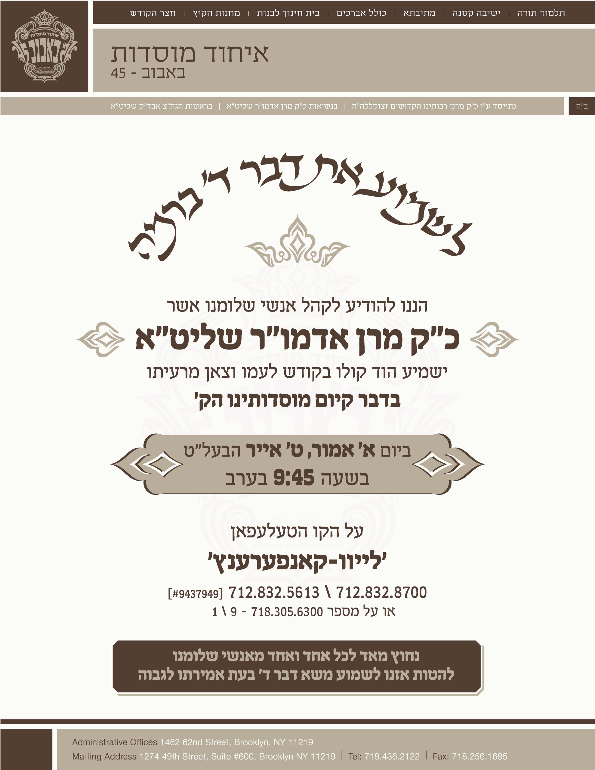 נייעס כ"ק אדמו"ר מבאבוב-45 שליט"א וועט היינט אויפטרעטן פאר קהל חסידיו לטובת מוסדותיו געשריבן דורך admin מאי 3, 2020 מאי 3, 2020 אוקטובר 16, 2025 בוקמארק 0 באבוב 45 בוקמארק כִּי פָנָה יּוֹם • ערב און מוצאי יום כיפור בחצר... אוקטובר 5, 2025 בוקמארק יומא אריכתא: עשרת ימי תשובה ערב און מוצאי יום כיפור... אוקטובר 5, 2025 בוקמארק בֹּאוּ שְׁעָרָיו בְּתוֹדָה: היסטארישער שבת פתיחת שערים פון נייעם גיגאנטישער... ספטמבר 28, 2025 בוקמארק וְיִתְּנוּ לְךָ כֶּתֶר מְלוּכָה • ערב און מוצאי ראש השנה... ספטמבר 28, 2025 בוקמארק כינוס הכנה פאר בחורי באבוב בארה"ק לקראת נסיעה קיין אמעריקא... ספטמבר 21, 2025 בוקמארק בְּדָרְשָׁם פָּנֶיךָ • סליחות ראשונות בחצר הקודש באבוב 45 ספטמבר 17, 2025 בוקמארק ניו יארקער מעיאר עריק עדעמס באזוכט אין נייעם גינגאנטישן בנין... ספטמבר 16, 2025 בוקמארק מעמד אדיר "ושכנתי בתוכם" לקראת דאס באנייאונג פון גינגאנטישן מרכז... ספטמבר 14, 2025 בוקמארק הונדערטער באבובער חסידים אין ארה"ק מיטגעהאלטן גייסטרייכע "באבוב'ער כינוס" –... ספטמבר 11, 2025 בוקמארק אמא של מלכות • האד' מבאבוב על קברה פון אמו... ספטמבר 9, 2025 שרייבט א קאמענט ביטול