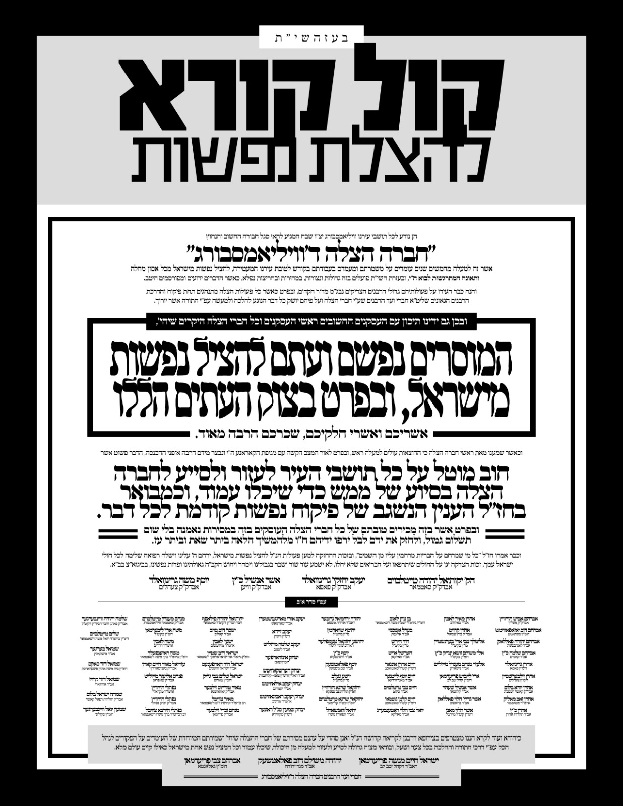 אין א פאראייניגטע קול קורא פון אלע אדמורי"ם ורבנים פון עיר ואם בישראל וויליאמסבורג, ווערן די תושבי העיר אויפגעפאדערט צו שטיצן ברוח נדיבה די לעבנס-וויכטיגע ארגאנעזאציע 'חברה הצלה'. די גדולי ישראל פאדערן אין דעם געמיינזאמען בריוו, אז עס ליגט א פליכט אויף אלע איינוואוינער ארויסצוהעלפן 'חברה הצלה' בסיוע של ממש כדי זיי זאלן ווייטער קענען אנגיין, ווי ס'ווערט געברענגט להלכה אז פיקוח נפשות קומט פאר יעדע זאך. די רבנים ענדיגן מיט שטארקע דברי חיזוק צו די חברי הצלה: "אשריכם ואשרי חלקכם שכרכם הרבה מאוד! גם ידינו תיכון עם העסקנים החשובים וכל חברי הצלה שיחי' המוסרים נפשם ועתם להציל נפשות מישראל ובפרט בצוק העיתים הללו".