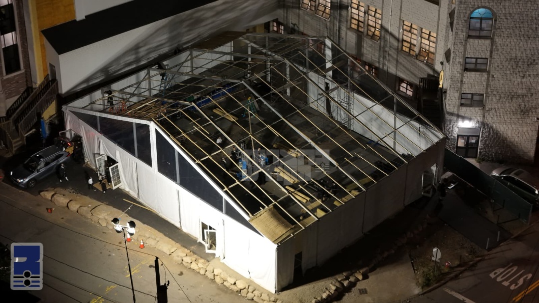 די נייע סוכה ווערט געבויעט אויפן ליידיגן שטח הארט נעבן דעם ביהמ"ד הגדול, ביי פילעס טערעס ביים ווינקל פון עליאט קאורט צווישן די ביהמ"ד הגדול און די היכל הטישן. אינעם ערשטן שלב פון די ארבעט האבן טראקטארן פלאך געמאכט די גאנצע באדן כדי צו קענען ארויפבויען דעם נייעם סטרוקטור. דערנאך איז די גאנצע שטח הערליך אויסגעפלאסטערט געווארן, און אין די יעצטיגע טעג ווערט פארענדיגט די נייע גרויסע סוכה, וועלכע פארמאגט א הויעכע דאך, ווי עס וועט קענען אריינגיין הויעך שטאקיגע פארענטשעס.