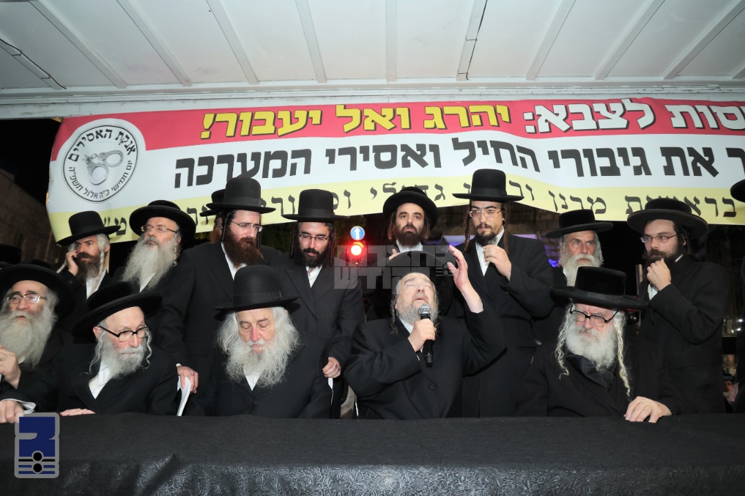 נעכטן ליל שישי האבן זיך שווערע טויזנטער אידן פונעם יישוב הישן אין ירושלים פארזאמעלט על פני כיכר השבת, ביים ריזן עצרת מחאה, אין שפיץ פון די גדולי ישראל, אדמור"ים חשובים און רבני ירושלים של מעלה.