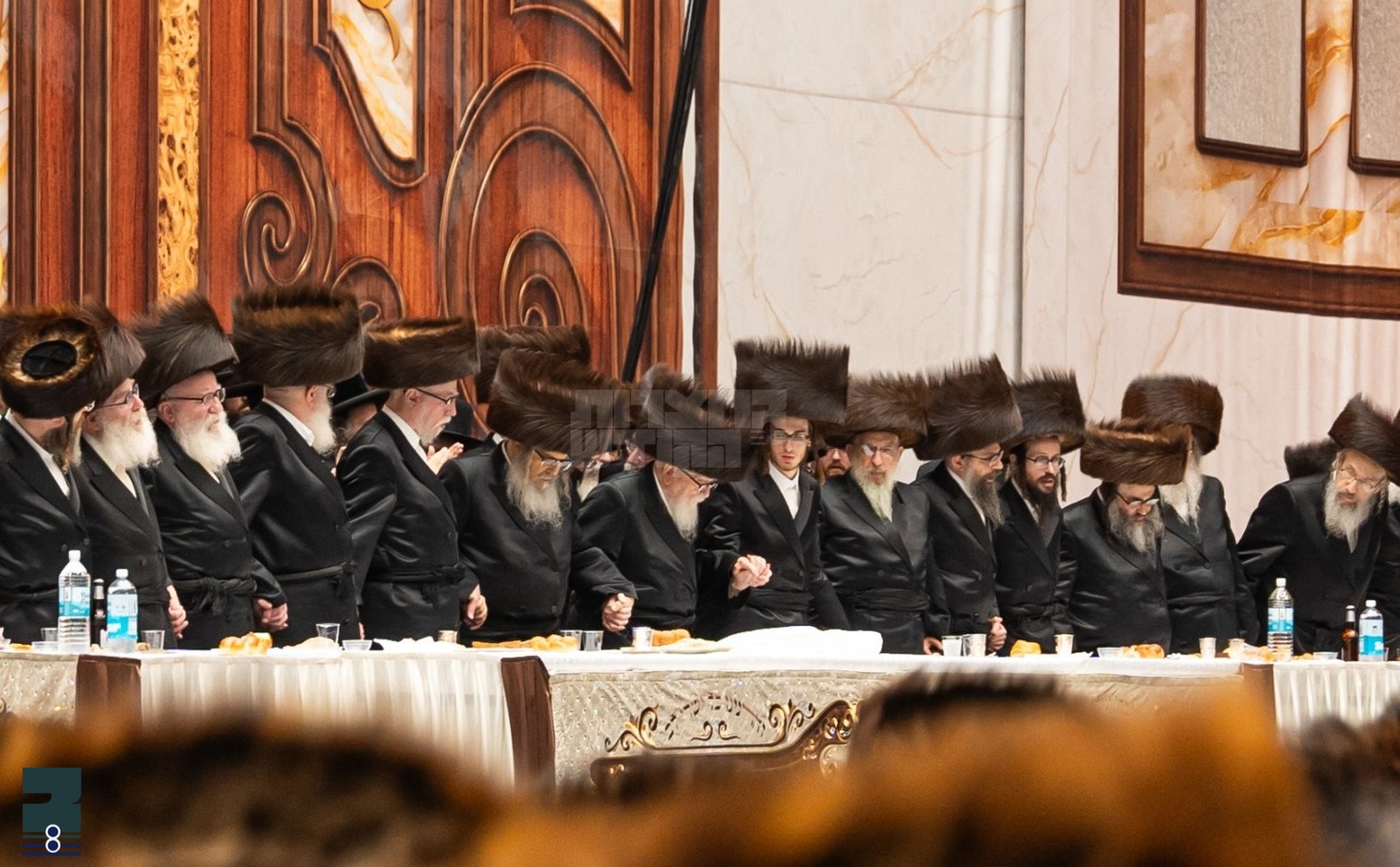 דערנאך איז געווען מעריב, און דער רבי איז צוריק ערשינען אין ביהמ"ד און זיך געוואשן צו די סעודה, מען האט אויפגעגעבן די מאכלים און געזינגען ניגוני שבח והודאה, דערנאך האט מען זיך ווידער ארויסגעלאזט אין א ריקוד של שמחה, און די גאנצע ציבור דורך ביים רבי'ן און די מחותנים וואונטשן לחיים בעת די בחורי חמד טאנצן מיטן חתן אין צענטער פון ביהמ"ד.
