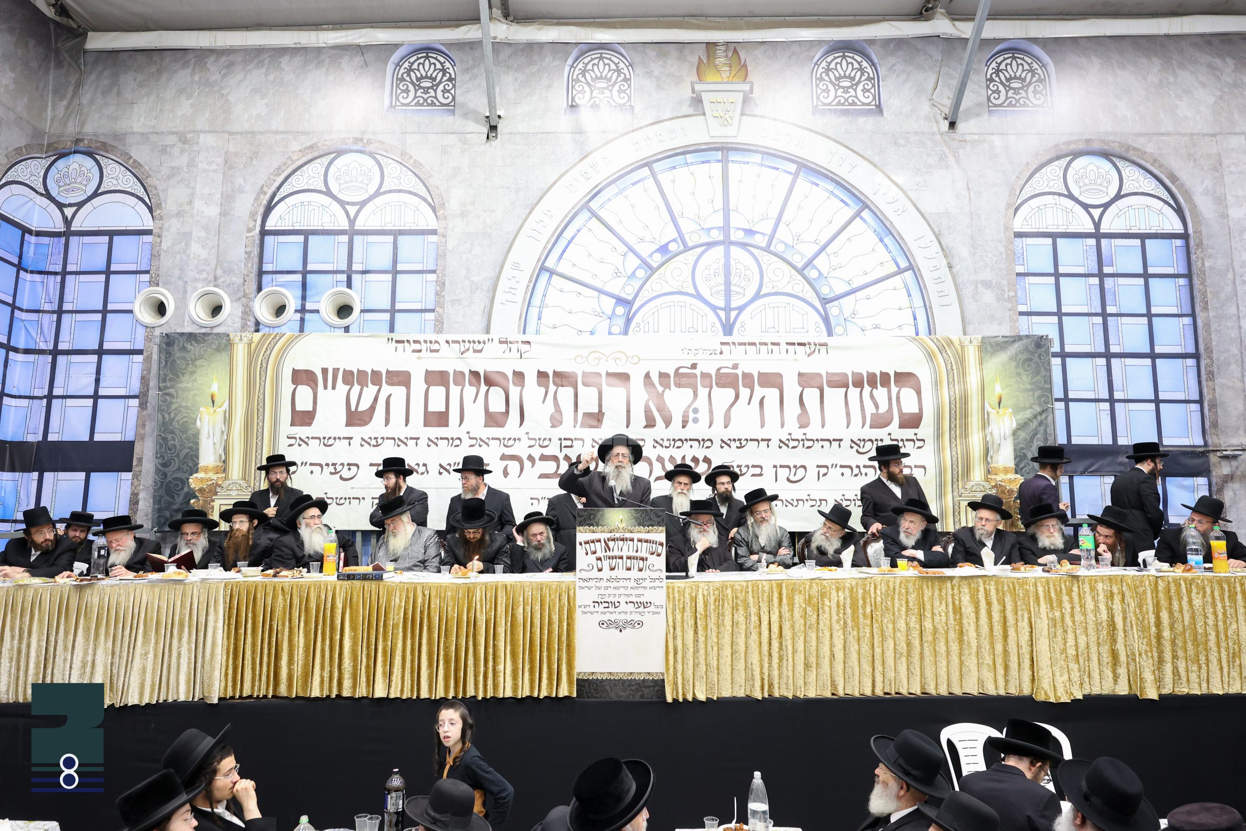 בראש המסובים האבן באשיינט דעם פני המזרח האדמור"ים מראחמיסטריווקא, משכנות הרועים, קהל חסידי ירושלים, סקולען ירושלים, קרעטשניף טשערנאוויץ, הגה"צ רבי משה קרעמער שליט"א ממנהיגי ק"ק ברסלב, הגאון האדיר רבי יהושע דוד טורצין שליט"א מנהיגי קהילת פרושים.