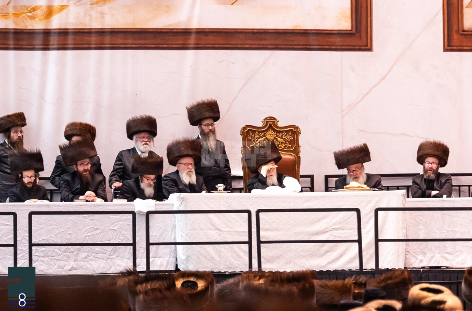 דורכאויס די טיש זענען אלע קינדער פון סקולענער רבי'ן מכובד געווארן מיט ניגונים, און די רבי שליט"א איז מכובד געווארן אנצוהייבן די תורה פארן סקווירא רבי'ן כנהוג. נאכן טיש האט דער סקווירא רבי מכבד געווען דער גאסט האדמו"ר מסקולען מאנסי מיט ברכת המזון על הכוס.