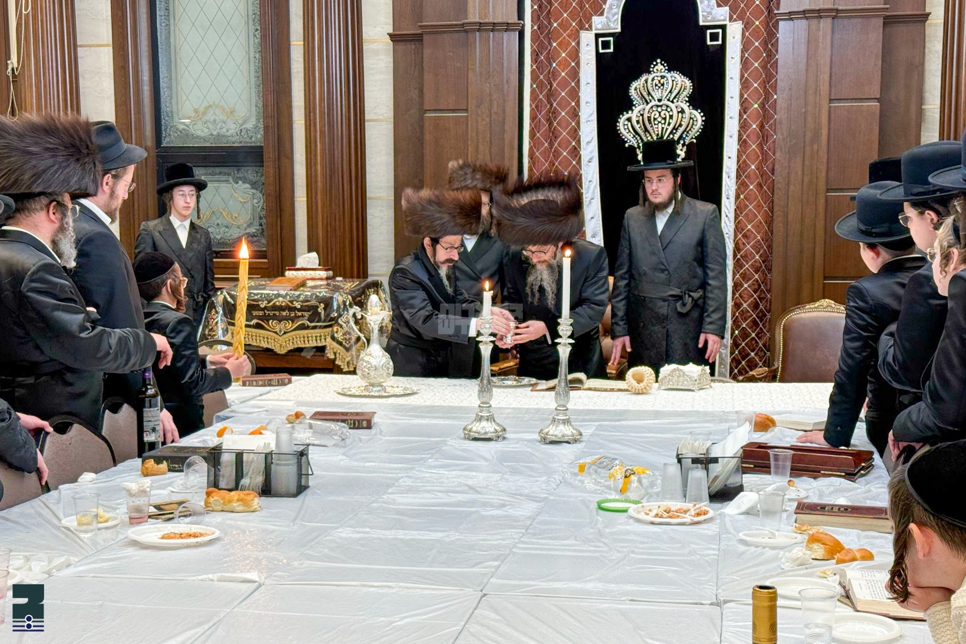די רבי שליט"א איז אנגעקומען בשעתן תורה, די פעטער די סקולענער רבי פון לעיקוואד האט געזעצט דעם רבי'ן נעבן זיך, און נאך שלש סעודות האט די רבי געדאווענט מעריב פארן עמוד זייענדיג אין יאהר. נאך מעריב האט די סקולענער רבי פון לעיקוואד געמאכט הבדלה און דערביי מכבד געווען דעם רבי'ן מיט הגבהת הכוס, נאך הבדלה האבן די זיך אדמורי"ם שליט"א געזעגענט ברוב ברכות.
