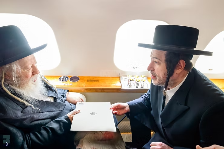 נעכטן בעפאר'ן ארויספליען פון ניו יארק אויפ'ן וועג קיין ארץ ישראל איז ארויפגעקומען צום רבי'ן אויפ'ן פליגער זיך געזעגענען הנגיד ר' יואל, וועלכער האט ווי שוין פריער באריכטעט צוגעשטעלט דעם פּריוואטן פליגער פאר'ן רבי'ן, און דער גערער רבי האט לכבודו אפגעראכטן א מסיבת לחיים וואו ער האט זיך באדאנקט פאר ר' יואל פאר'ן צושטעלן דעם פליגער מיט אלע באקוועמליכקייטן. הארט בעפאר ר' יואל איז אראפּגעגאנגען פונעם פליגער האט ער איבערגעגעבן א בריוו פאר'ן רבי'ן.